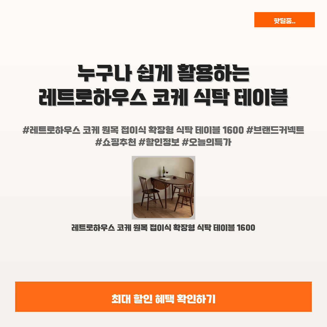 🛍️ 이 포스팅은 네이버 쇼핑 커넥트 활동의 일환으로,판매 발생 시 수수료를 제공받습니다.오늘 소개할 제품은 단연코!바로 레트로하우스 코케 원목 접이식 확장형 식탁 테이블 1600 입니다!주말마다 모이는 가족들과의 소중한 시간을 위해, 실용적이면서도 세련된 테이블을 찾고 계신가요?"레트로하우스 코케 식탁 테이블 1600"은 그런 여러분의 고민을 완벽히 해결해줄 아이템입니다!이 식탁 테이블은 우아한 디자인과 함께 접이식 형태로 공간 활용도 또한 뛰어나요.친구나 가족과의 함께하는 순간, 이 테이블이 있어야 더욱 특별해질 거예요.더욱이 지금 놀라운 76% 할인으로 가성비까지 만점이니, 기회를 놓치지 마세요!주저하지 말고, 여러분의 집 안을 한층 더 멋지게 바꿔줄 레트로하우스 코케 원목 접이식 확장형 식탁 테..
